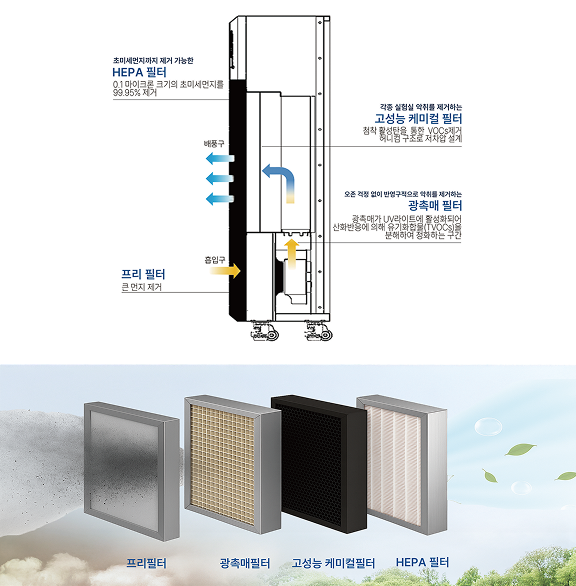 | 필터 | 1차: 항균프리필터 2차: 산소발생 광촉매 필터 3차: 고성능 케미칼 필터 4차: 헤파필터 |