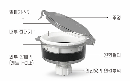 - 폐시약 안전 깔때기에 있는 벤트 홀을 통해 페시약 보관 용기 안의 유해가스 정화되어 방출